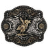 Add bold western attitude to your look with this intricately designed scalloped belt buckle. Featuring an antique silver-tone finish, the buckle highlights a central bull rider surrounded by flame scrolls, cracked texture details, and sunburst accents. The darkened background and bright filigree enhance its dramatic flair, while punch stud trim completes the rugged design.